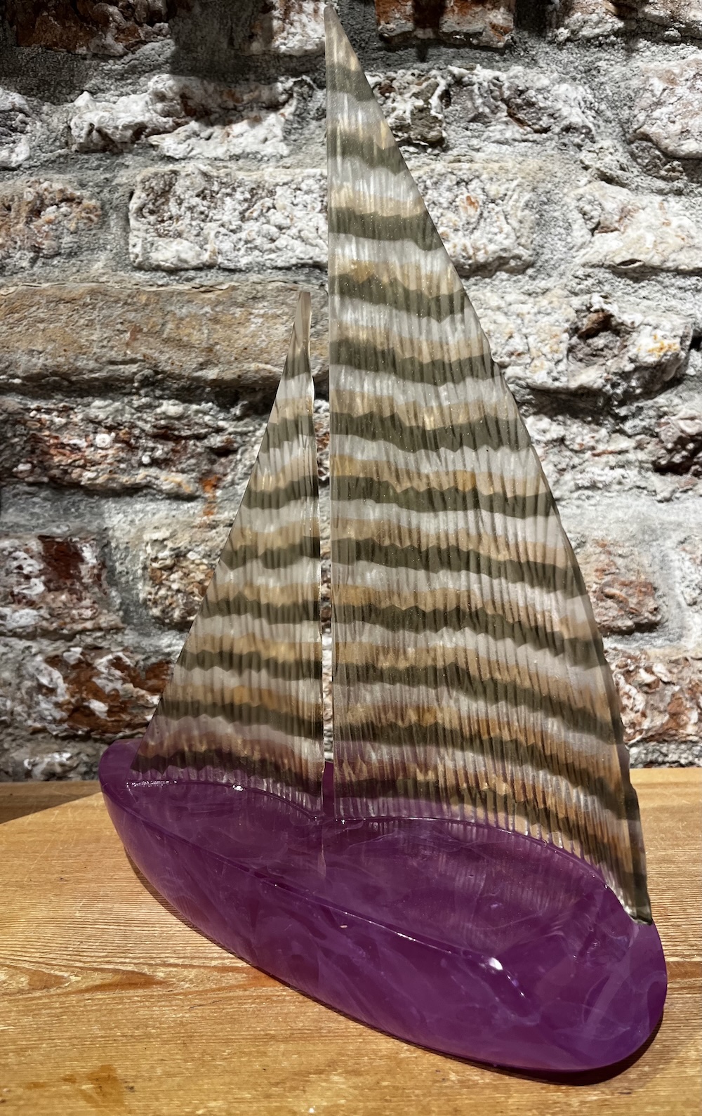 Solid Murano glass sailing boat, featuring a sail handcrafted with the traditional hammering technique