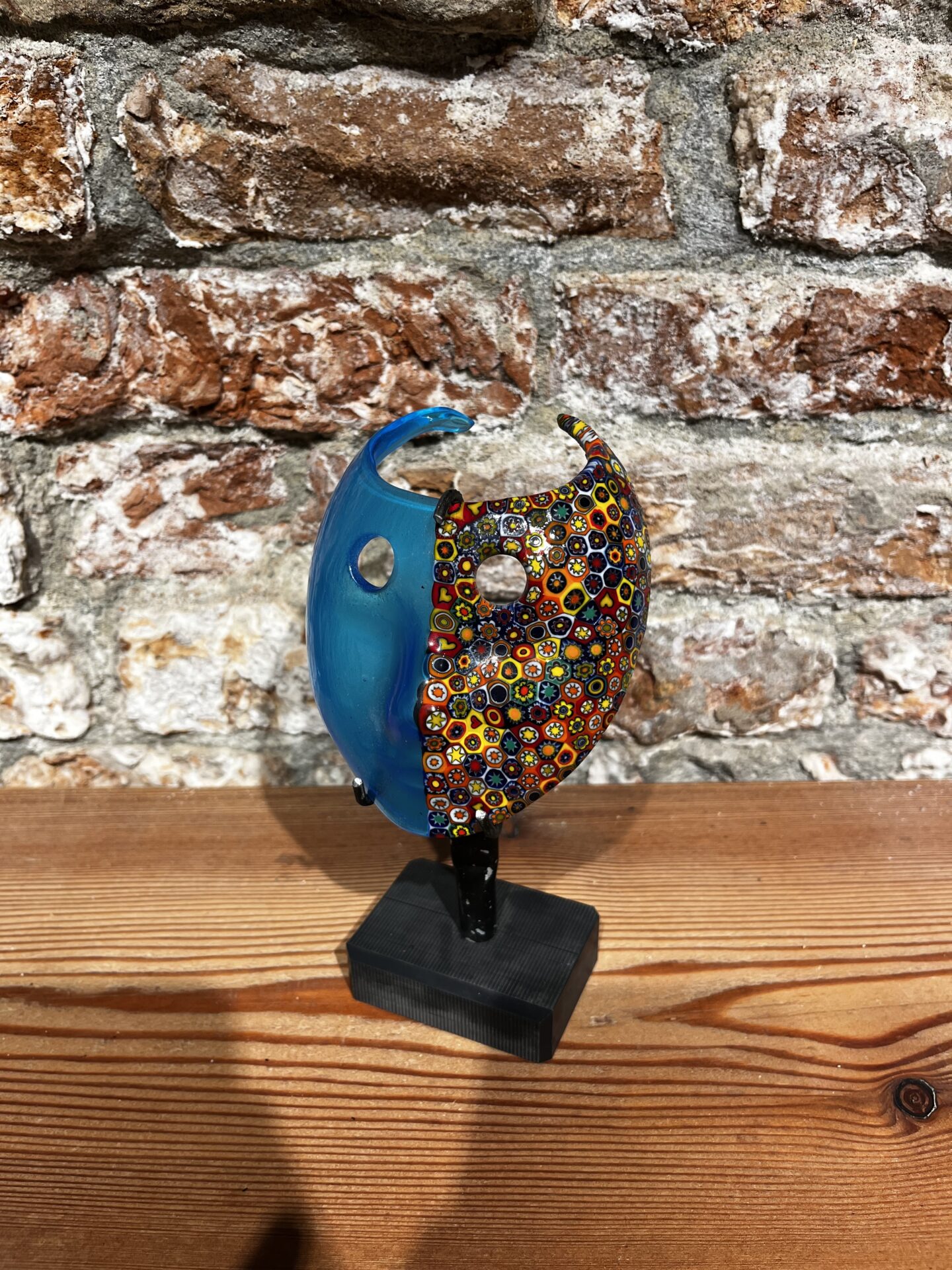 Decorative mask inspired by a little devil, made by combining fused glass cane and murrine techniques Perfect as a souvenir, the display stand is included in the price