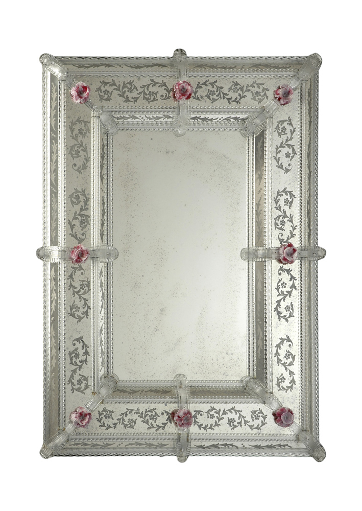 Venetian mirror, in hot colored-fusion Murano glass, hand engraved with the use of a diamond wheel. Aged with the particular mercury antiquing technique. DIMENSIONS: 90×120 cm