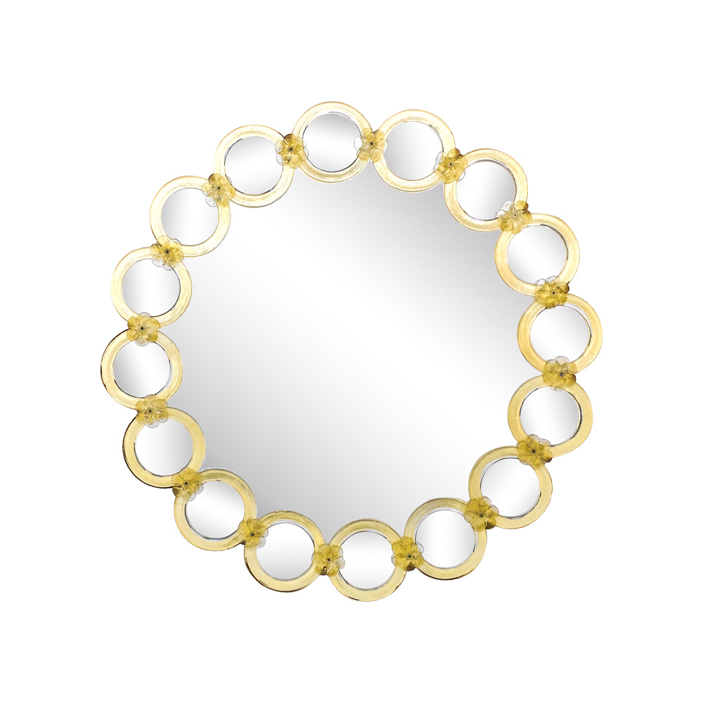 Design mirror, with circles in hot-colored fusion Murano glass. DIAMETER: 80 cm