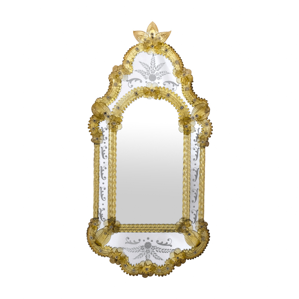 Venetian mirror, in hot colored-fusion Murano glass, hand engraved with the use of a diamond wheel. DIMENSIONS: 46x66H (cm)