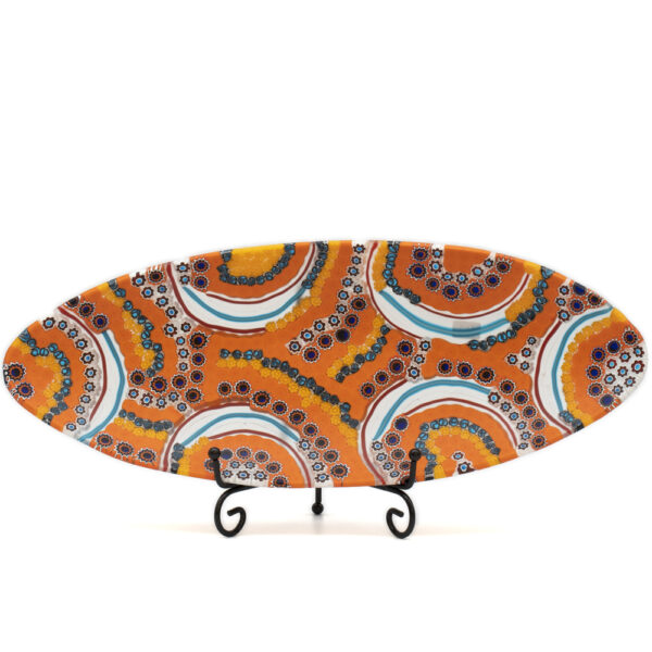 piatto canoa con murrine e filigrana. Questo prodotto è stato realizzato interamente a mano con la tecnica del vetrofusione.Linea regular. DIMESIONI: larghezza 13,5cm; lunghezza 35 cm; altezza 3 cm.