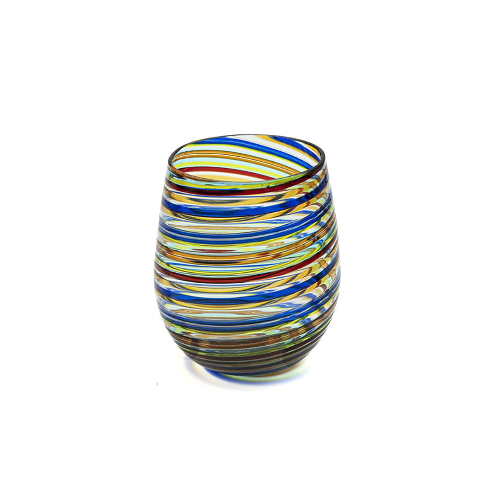 bicchiere tondo in filigrana coolorata, realizzato con la tecnica del vetro soffiato. Questo bicchiere è ottimo per adornare la vostra tavola per qualsiasi evento. DIMENSIONI: Diametro 6,5 cm; altezza 11 cm.