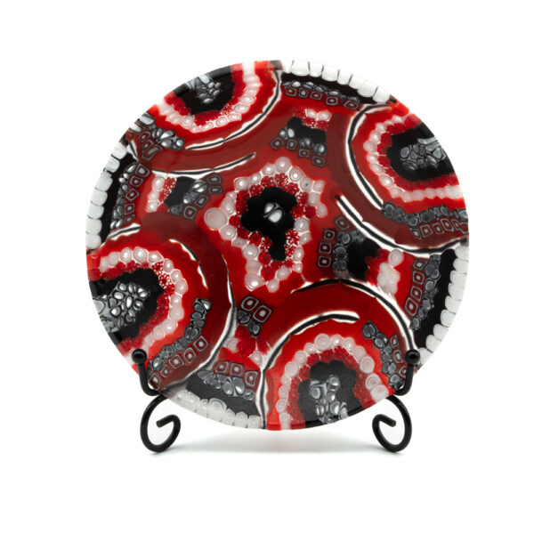 ciotola in vetro di Murano realizzata con la tecnica del vetrofusione fondendo assieme sezioni di bacchette di vetro colorato, ciascuno raffigurante un disegno, chiamate murrine.